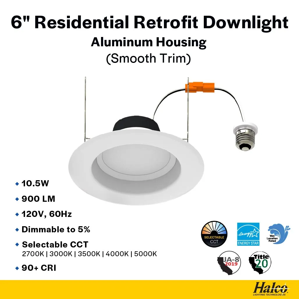 6" 10.5W Residential Retrofit Downlight, CCT Selectable, Smooth Trim by Halco
