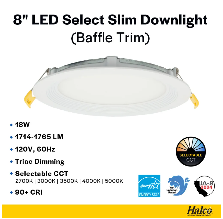 Home Downlights 8" 18W Residential Direct Fit Slim Downlight Selectable, Baffle Trim by Halco