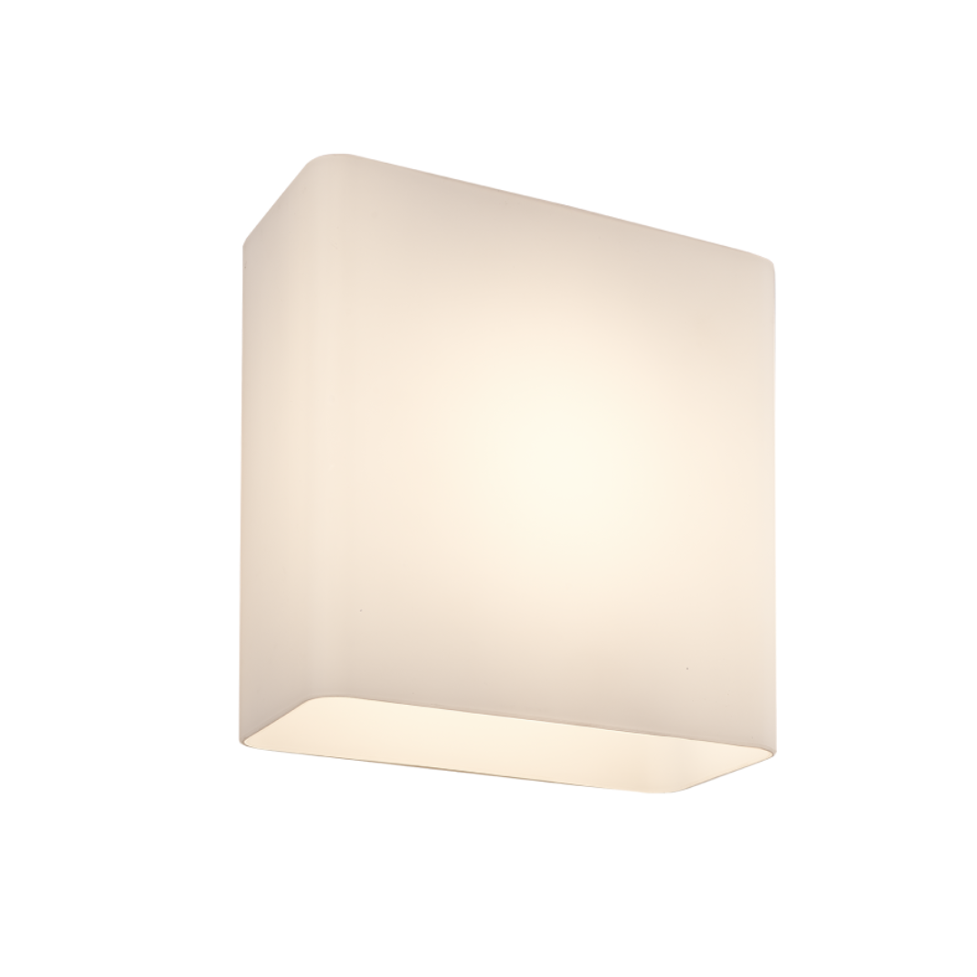 Glaz is a decorative sconce with warmly illuminated opal glass. It has a cubical form factor and is ADA compliant. Glaz mounts to a standard 4" junction box with a white finish canopy.