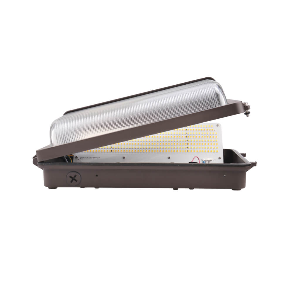 ETi SSL's Modern Wall Packs have shallow backboxes and textured tempered glass, providing a soft, diffused light quality. These versatile wall packs have 3 selectable CCTs and Wattages, with hinged housing for easy access to wiring and CCT and Wattage switches.