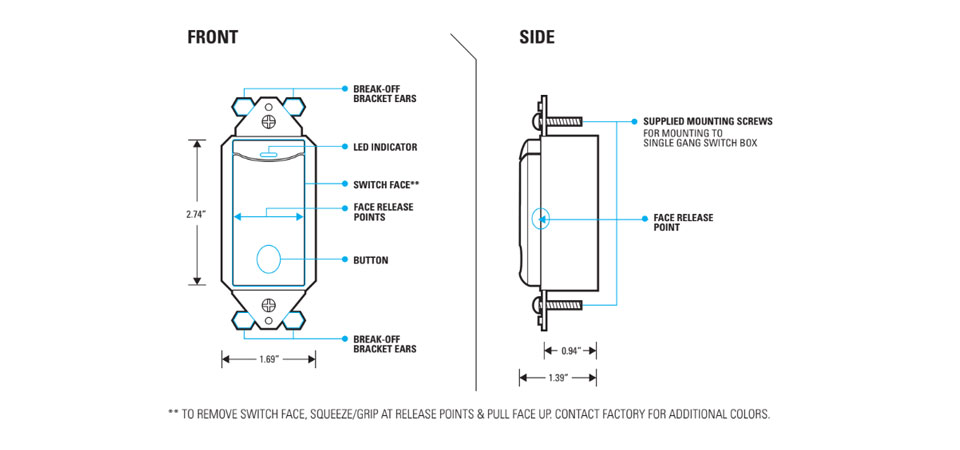 The SENSORWORX line voltage wall switch provides a simple solution for spaces where switching from one or two locations (i.e. 3-way switching) is required. In particular, this unit provides a companion upstream 3-way switch for a SENSORWORX model SWX-823 dimmer for 0-10V lighting loads. The visual style of this single-button toggle switch matches the rest of the SENSORWORX family of wall switch occupancy sensors and dimmers.