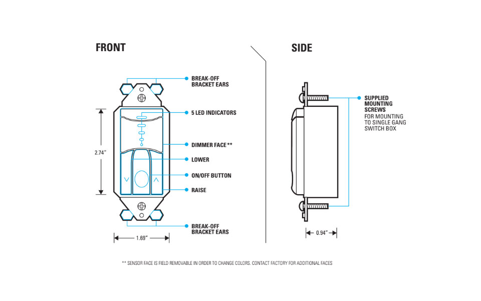 The SENSORWORX line voltage wall switch & 0-10 volt dimmer provides a stylish solution for spaces where manual dimming control is required. Designed with contractors in mind, the unit is significantly shallower than typical dimmers, resulting in less crowded wall boxes. Additionally, versatile wiring enables usage with or without a neutral connection. For dimming adjustment, intuitive raise and lower buttons are present in addition to the on/off button. Five vertically stacked LEDs are provided to indicate the current dimming level. Configurable dimming parameters include High/Low Trims, Turn on Levels, and Curve Types. This dimmer also matches the SENSORWORX family of wall switch occupancy sensors and 0-10V dimming wall switch sensors.