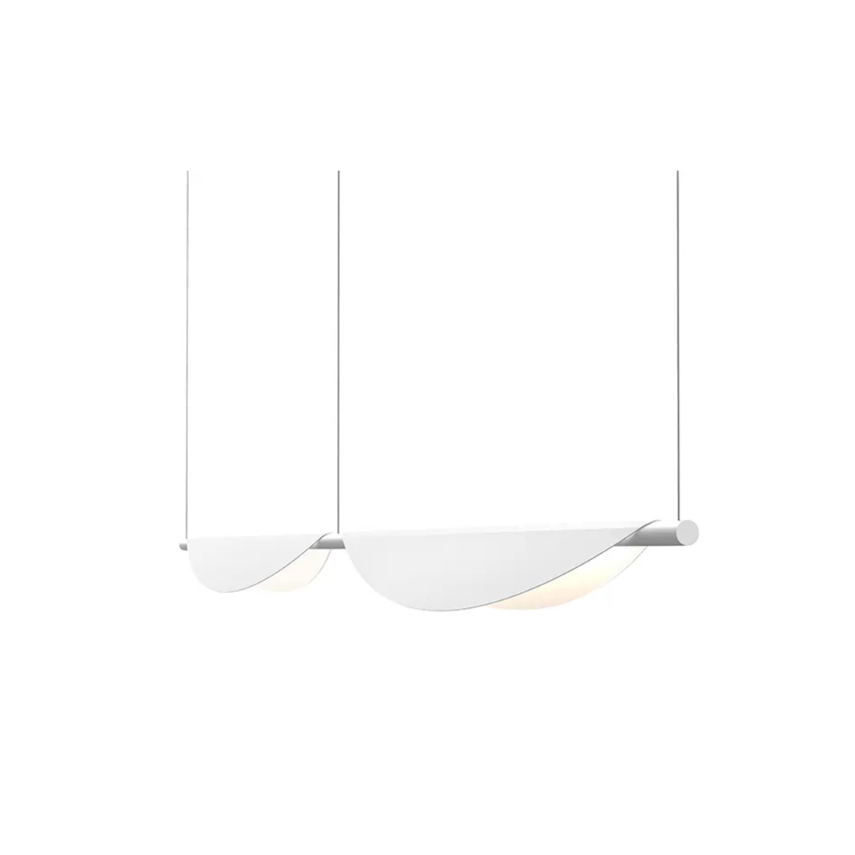 Elegantly draped along the axis of a tubular LED source, this flowing reflector directs the linear illumination downward. Tela can be used singularly or in an end-to-end linear configuration of multiple lengths as desired. Its sophisticated simplicity brings a sculptural flowing rhythm along a surface or within a linear space.