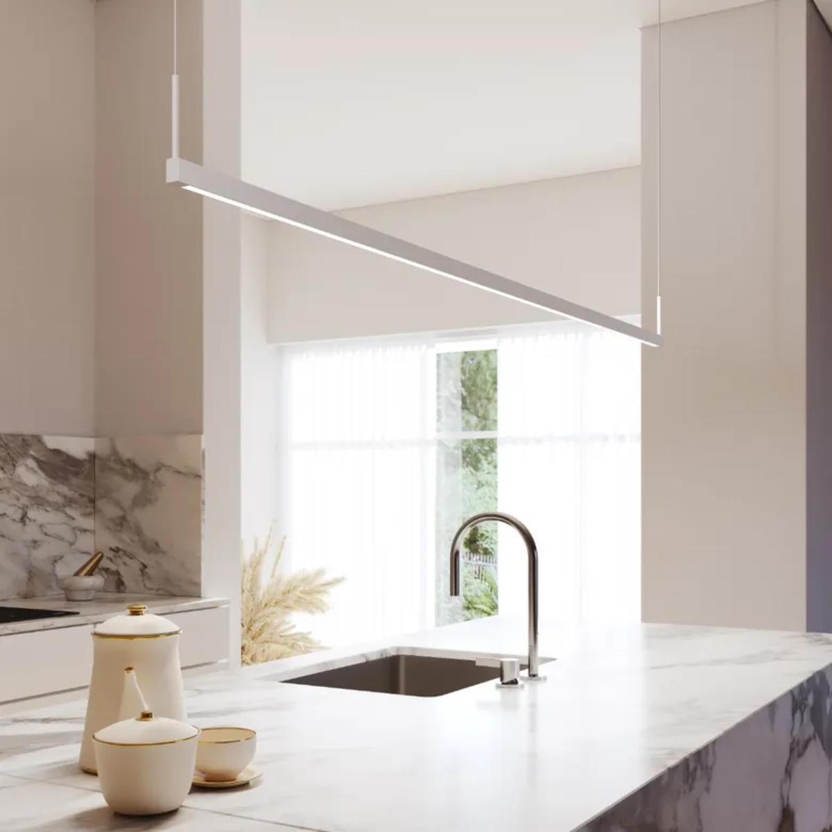 A system of minimally scaled LED linear pendants, uplight/downlight wall bars, and indirect light wall bars, Thin-Line is offered in a variety of lengths, finishes, and lighting configurations.